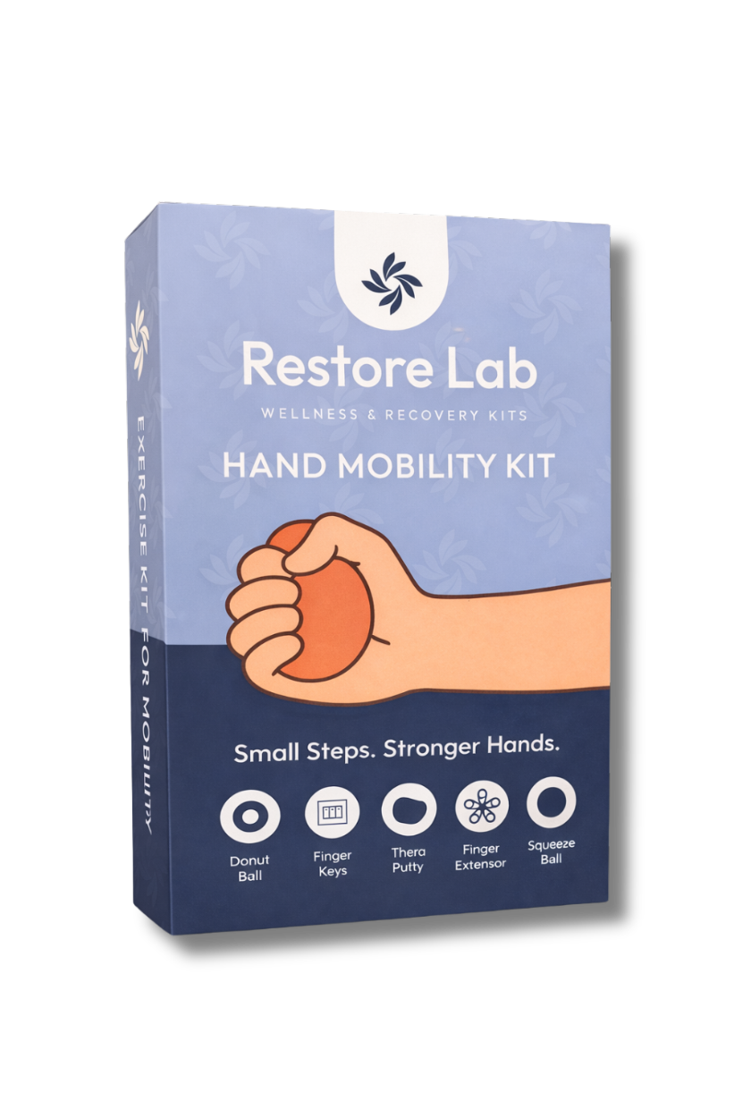 RestoreLab Hand Therapy Kit is designed to support hand strength, mobility, and comfort for individuals experiencing stiffness, weakness, decreased mobility, postpartum changes, or overuse. Curated by licensed physical therapists, this all-in-one kit provides safe, effective tools for at-home hand exercises.